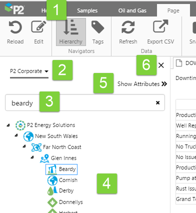 Data (entities, and their attributes) that has been organised into a hierarchy in P2 Server can be located using the Hierarchy Navigator. A flat list of tags can be located using the Tag Navigator.