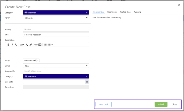Once you have completed the form, clicking Submit will save the record. Everyone with permission will then be able view the case and other tasks like the rules engine, will be executed.