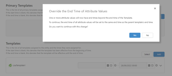 In this version, when you change the end time of a template, and that time is earlier than one or more of the end times of the underlying Attribute Values, there is now the option to automatically set those end times to the same value.