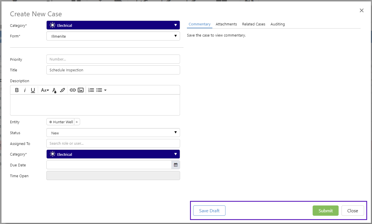 Once you have completed the form, clicking Submit will save the record. Everyone with permission will then be able view the case and other tasks like the rules engine, will be executed.