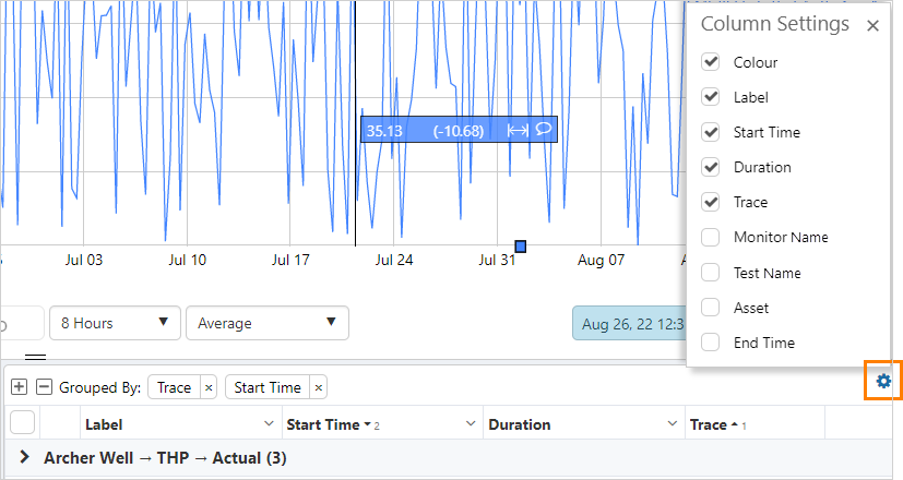 Column Settings, opened from the settings cog, allows users to filter the time windows by selecting which fields to display in the table. Only time windows with data in one of the selected fields will be being displayed.