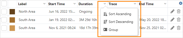 In instances where there are a lot of time windows on a Trend, it can be difficult to find a specific one. To make it easier, filter, sort and group options have been added to the time windows table.