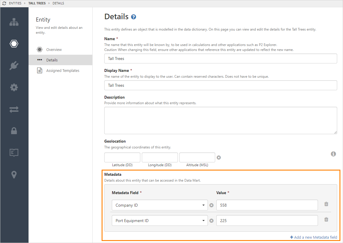 Metadata can be added to an entity by setting a value for a Metadata Field.