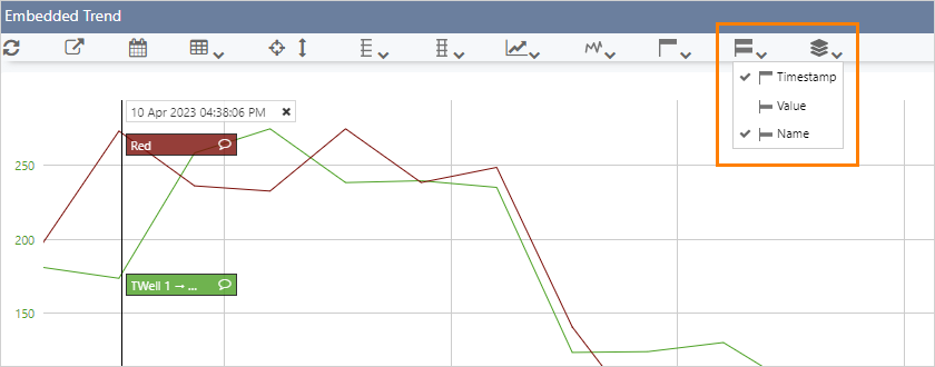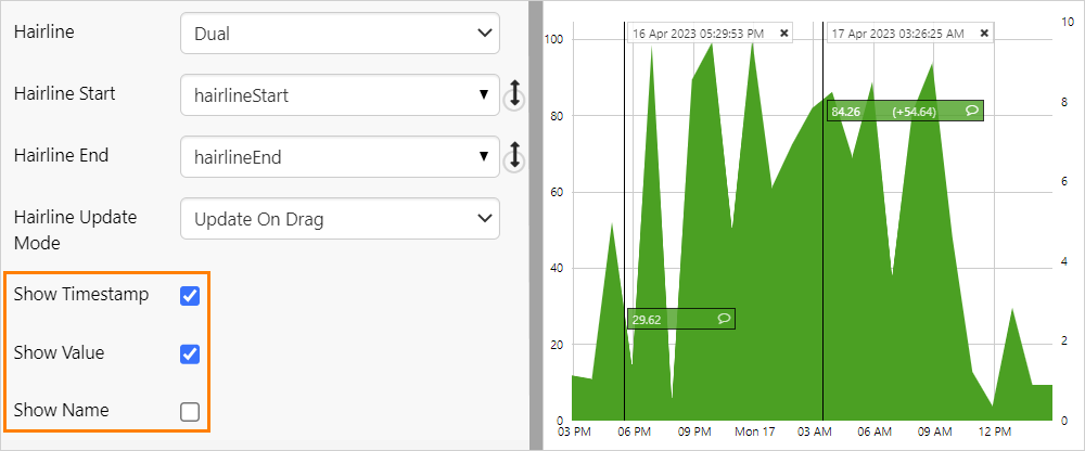 In the chart configuration, the hairline can be configured to show or hide Timestamp, Value, and Name.
