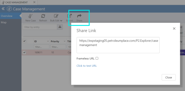 The option to share a link to the Case Management page has been added to the toolbar.