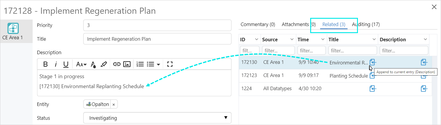 The button in the Related table enables the title and/or description of related entries to be copied to the description field in the current entry.