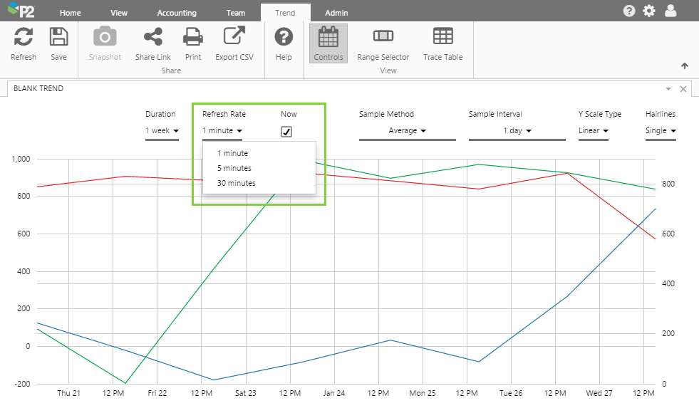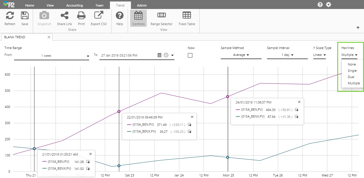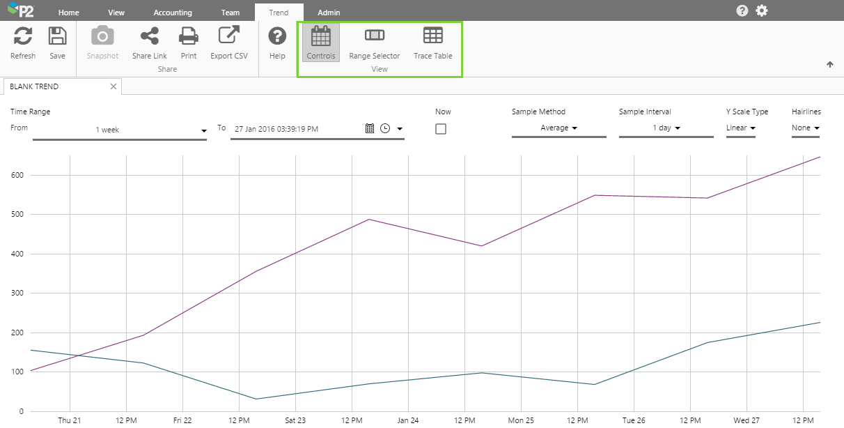 - Show/Hide Trend Elements: New buttons on the Trend tab in the ribbon allow you to show or hide parts of the trend: the controls (e.g. time range), the range selector (below the trace) and the trace table.