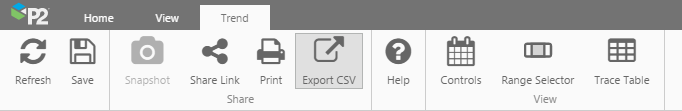 - Export Pages and Trends: In Explorer 4.3.2, the Export to CSV function has moved to a new button on the Page and Trend tabs. These allow you to export data on the page or trend to a .csv file.