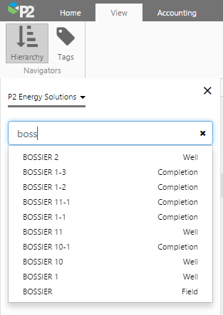 In P2 Explorer 4.3.2, users can use the Hierarchy navigator in the ribbon to search for a particular node. As you type, matching nodes will automatically appear in a drop-down list.