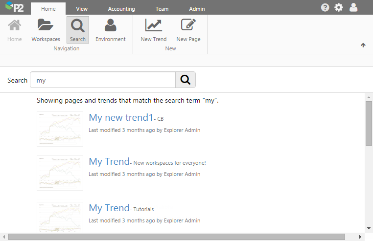 - Search: The Home tab of the ribbon has a new Search button, which allows users to search for pages and trends. The search results show the name of the page/trend, the workspace it’s in, and when it was last modified along with who modified it.