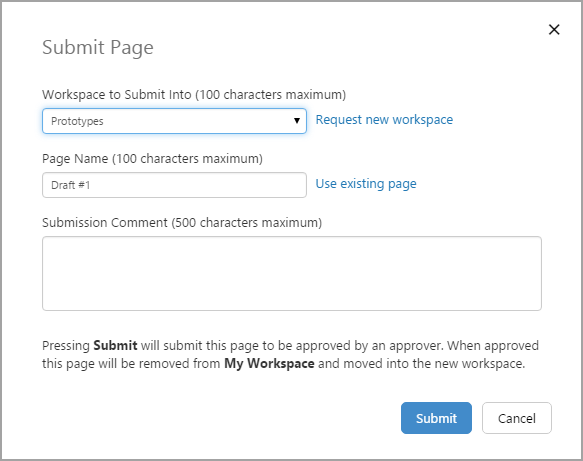 During editing, a page designer may submit the page for publishing to another workspace. A user with appropriate privileges will then be able to review and approve the page.