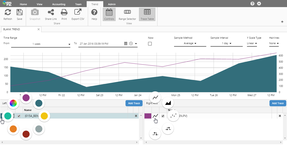 - New Trace Table: The trend’s new trace table allows you to group tags/attributes in the left and right axes. You can also change the colour and style of the trace using the modern dial control.