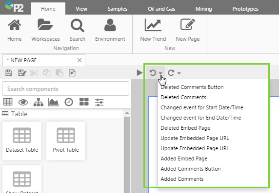 Release 4.3.2 of P2 Explorer introduces the undo/redo function in Explorer Studio. When designing a page, familiar undo and redo buttons appear above the canvas. You can undo/redo your last action, or click the down-arrow to undo/redo several actions.