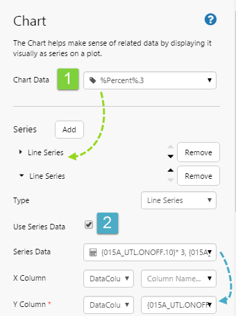In previous versions of Explorer, chart data was defined for the whole chart, and each chart series used a data column from the chart’s dataset. In version 4.4.6, the chart has been enhanced so that each chart series can optionally use data from its own data source. In the diagram, the first series uses the data defined in Chart Data [1 in diagram], while the second series uses data from a separate Series Data source [2 in diagram].