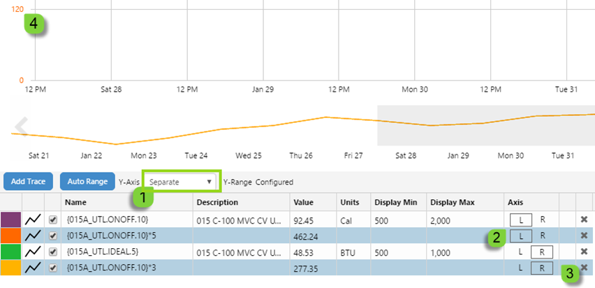 For the Separate Y-Axis configuration (the default setting for a new trend), the current Display Minimum and Display Maximum for each item is used to determine its Y-Axis. Each item is plotted against its own Y-Axis, but with only one Left Y-Axis and one Right Y-Axis displayed.