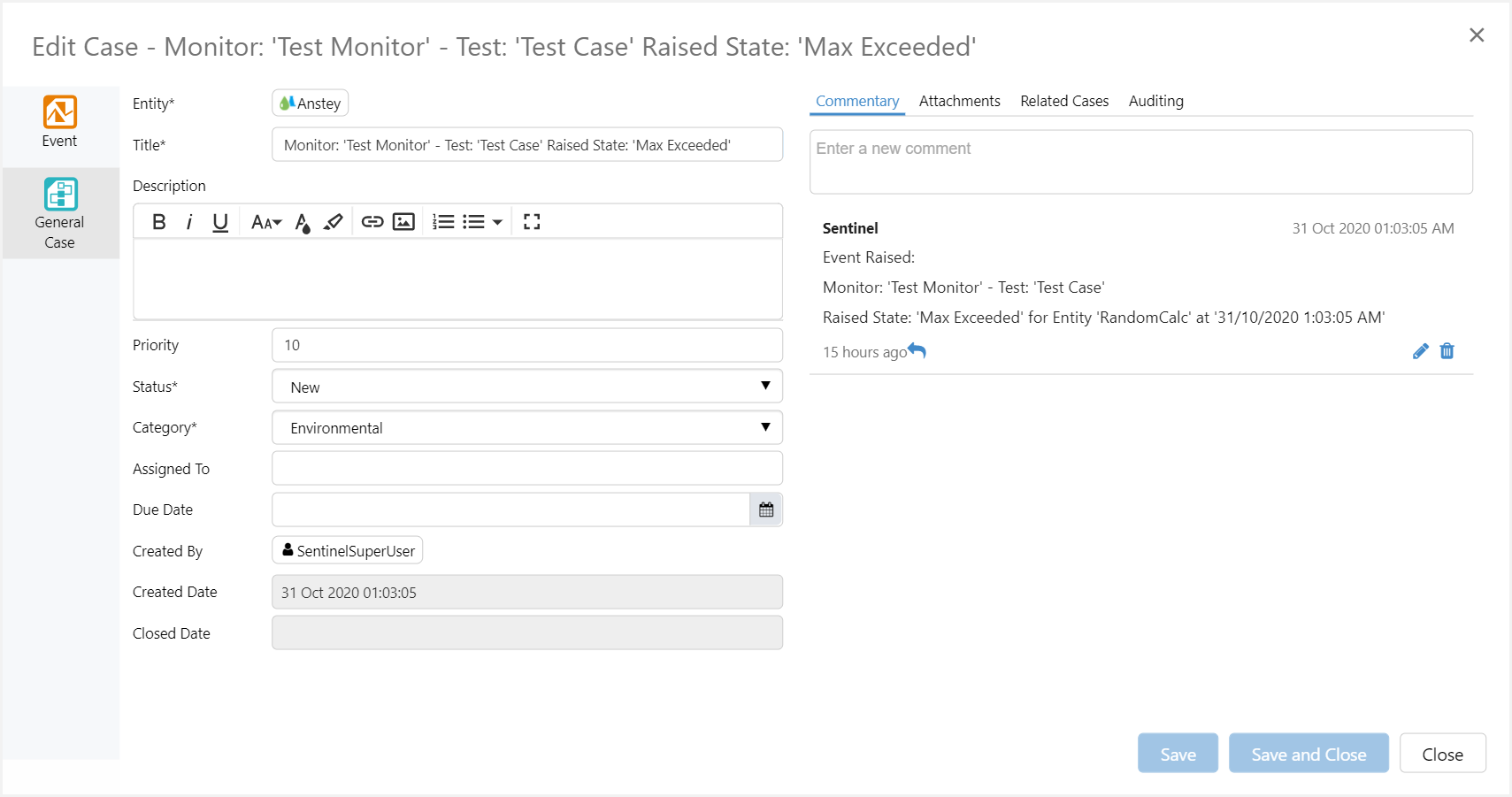 Cases that were created as a result of a Sentinel event will now display details of the event from within Case Management, when the entry is opened.