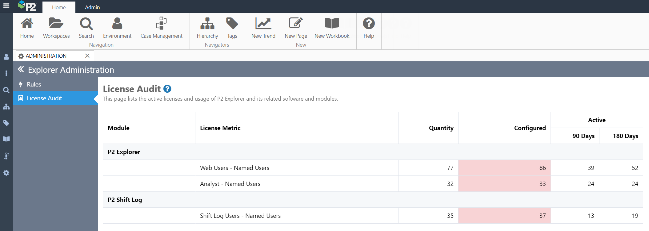 P2 Explorer Administration is now able to show license usage for Explorer and Shift Log. This improves transparency and management of end user licensing.