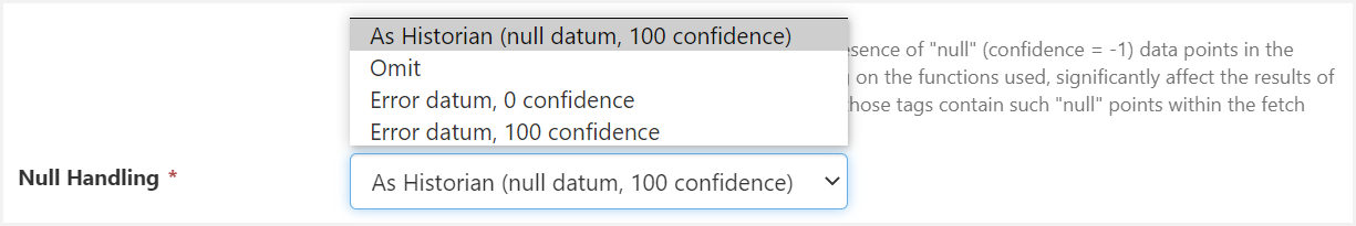 - Null Handling: This parameter controls how the adaptor handles the presence of "null" (confidence = -1) data points in the historian. Note that changing this setting can, depending on the functions used, significantly affect the results of calculations based on tags from this datasource, should those tags contain such "null" points within the fetch range (default: As Historian).