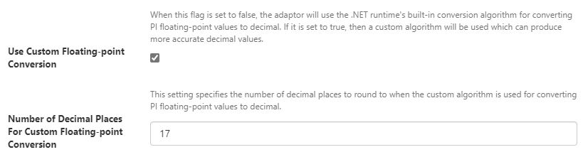 - Use Custom Floating-point Conversion: When this flag is set to false, the adaptor will use the .NET runtime's built-in conversion algorithm for converting PI floating-point values to decimal. If it is set to true, then a custom algorithm will be used which can produce more accurate decimal values.