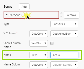 Step 2: Click a series to open it (for example, click Bar Series). Type a name in the Name edit box (or select a Variable from the variable drop-down list). The name should match the series' Y Column (for example, if the Y Column uses actual costs, you could type 'Actual' in the Name edit box).