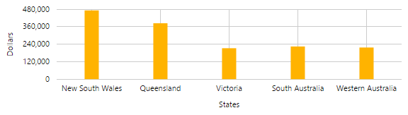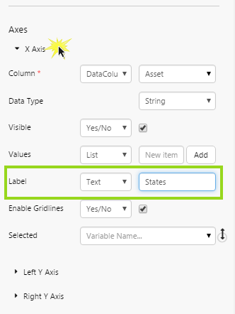 Tip: The label should match the data from the column used for that axis. For example, if your X Axis uses States, display States in the label, and if your series plotted against the Left Y Axis are showing a dollar value, the label should reflect this.