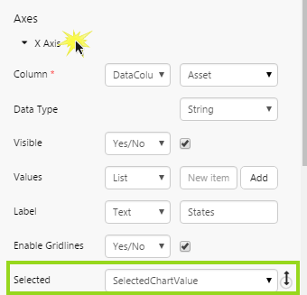 It is possible to configure a chart such that when a user clicks on an area of the chart, this updates a variable on the page with the selected X Axis value (the variable is then used by other page components, such as a text label, or a parameter to a dataset query, or a variable for a hyperlink).