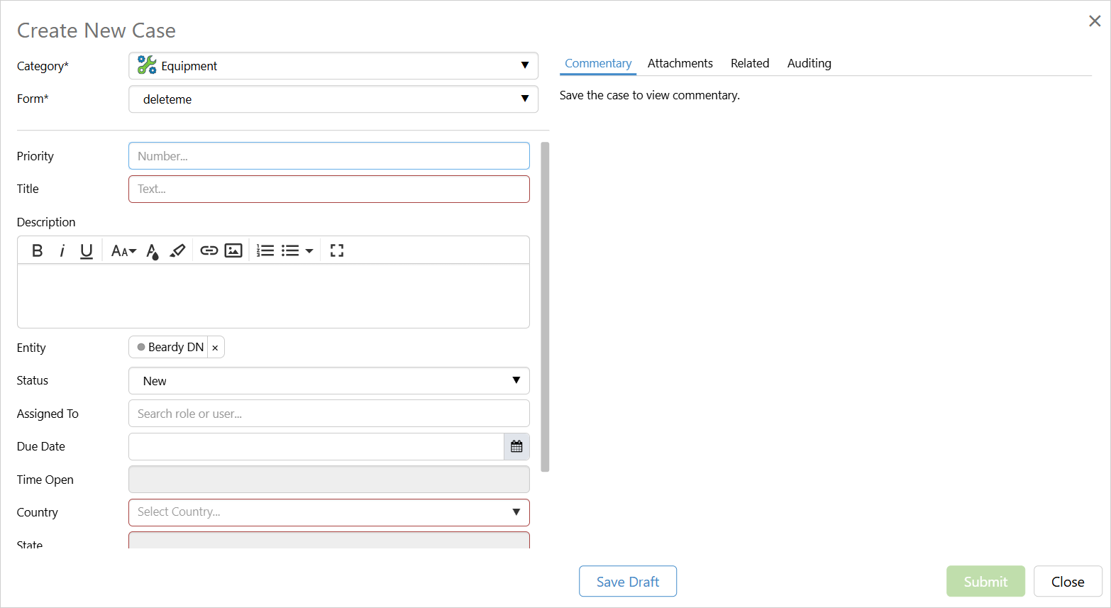 The new case entry dialog will open. Fill out the necessary fields and click submit.