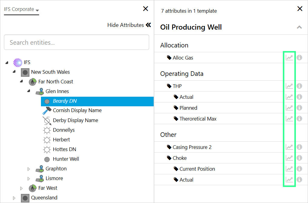 A templated trend allows you to use the Hierarchy Navigator to change the entity for an attribute displayed in the trend. You can create a templated trend by using the entity keyword in place of an entity name, when specifying an attribute for a trace. E.g. {entity[Water Injection Well]:Injection Rate!Actual}