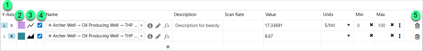 [1] Axis: Make use of the two Y axes (Left Axis and Right Axis), by grouping trace lines belonging to similar items or those that are within a similar range into either the Left Y-Axis (L) or the Right Y-Axis (R)