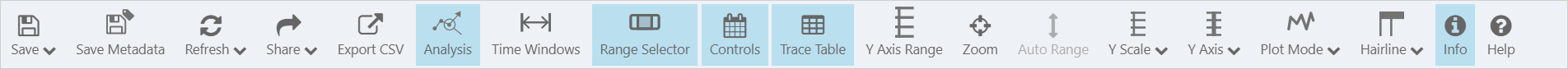 The Save Metadata button is only active if you have added Tag data to the trend. If you have appropriate privileges, clicking this button allows you to save changes to the description, units, min, and max values for the tag.