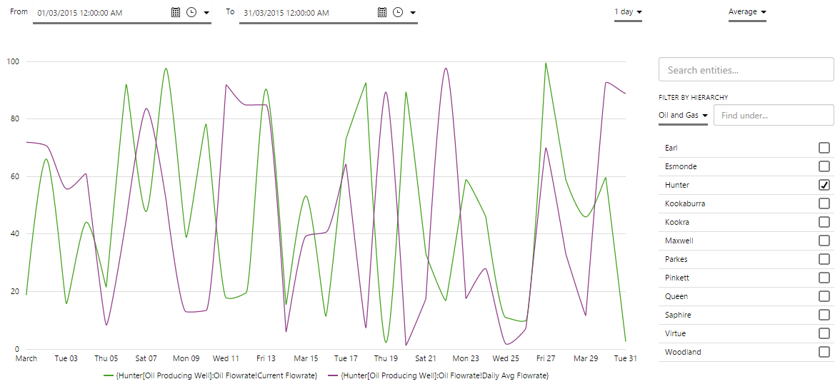 Specify one or more entities for which to display data. You can choose the list these entities explicitly or you can subscribe to an event. You can further restrict the entities to ones that are associated with a specific template (e.g. Oil Producing Well) and that have a specific attribute (e.g. tubing head pressure). |