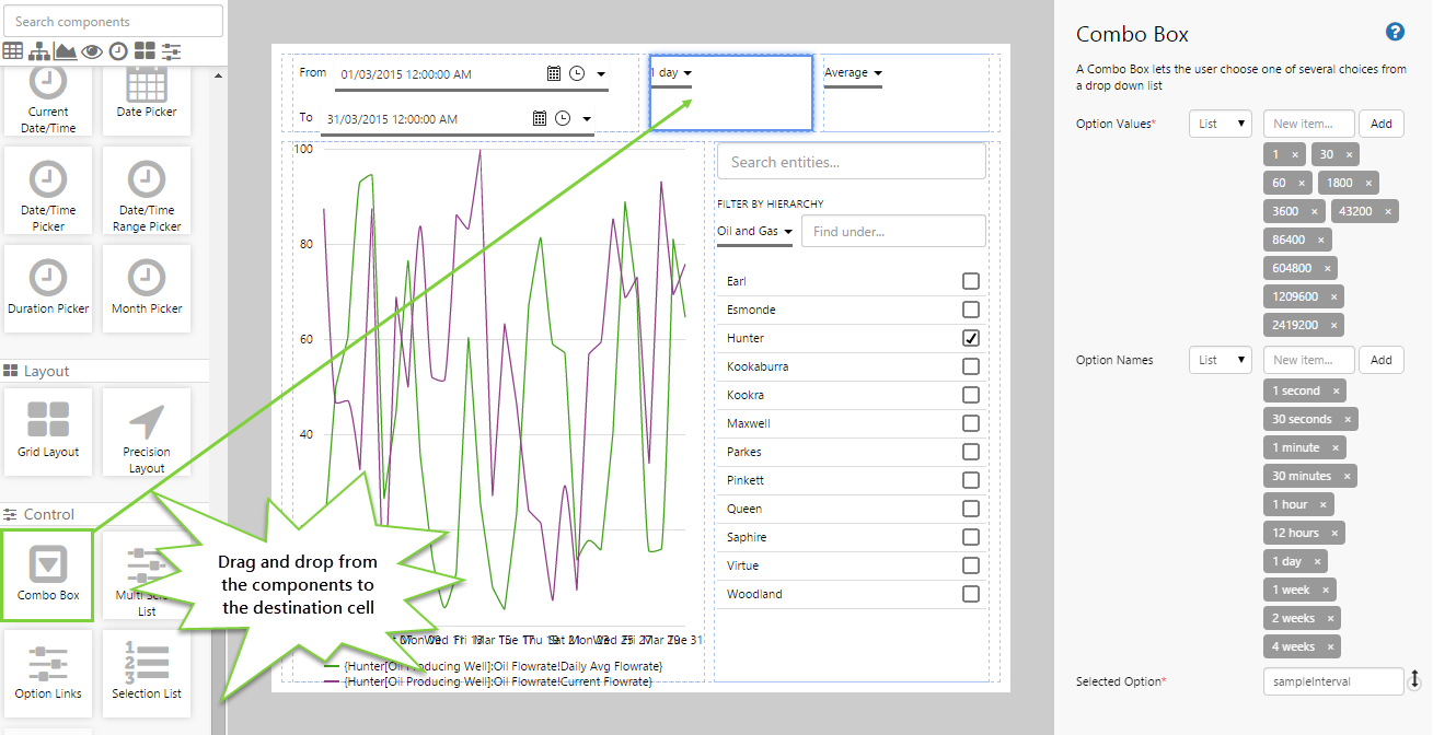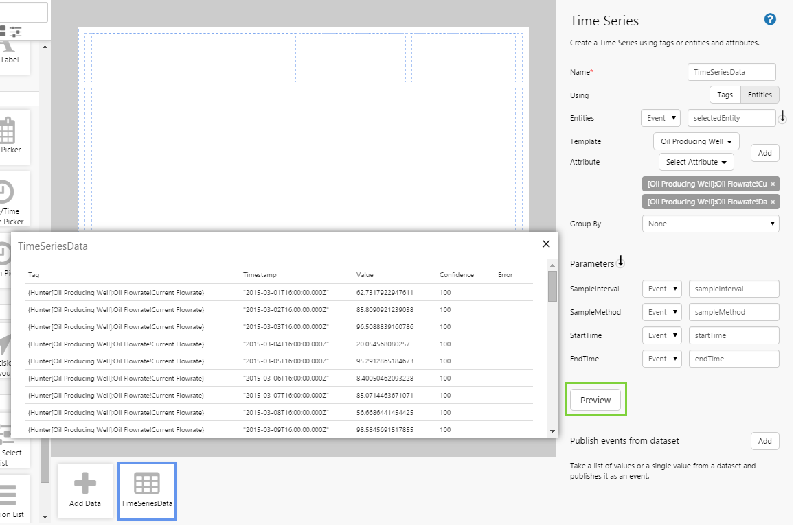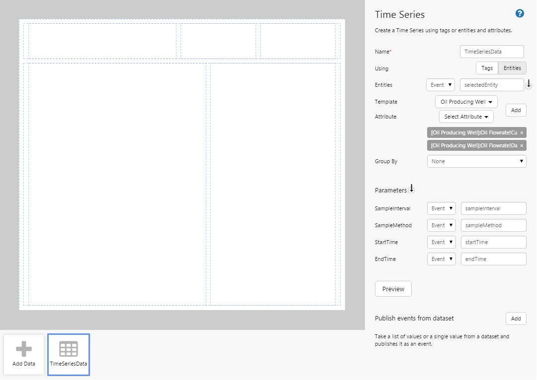 Time Series data is used to display real-time data on a page, and is useful in live monitoring situations. In this tutorial we’ll add Time series data for a well to a line chart. We'll also add components that allows the user to change the time range, sample interval, sample method, and the well being monitored.