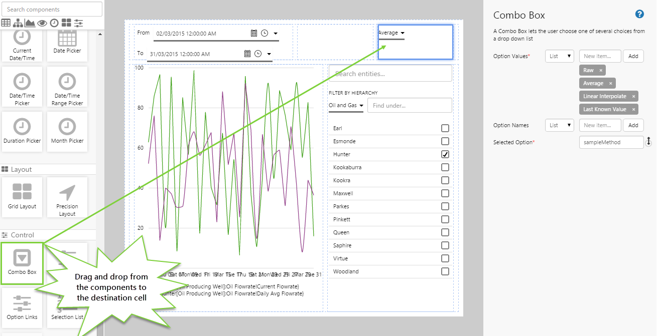 Congratulations! You have configured time series data that displays well flow rates in a line chart. The user to change the time range, sample interval, sample method, and the well being monitored.