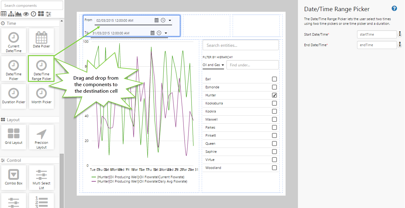 - Drag and drop the Date/Time Range Picker component onto the canvas.