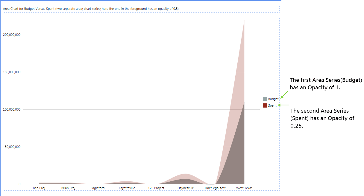 Determines how transparent or opaque the area is. Values range from 0 to 1 (although 0 is invisible). This is useful when you add more than one area series, with the areas in the background showing through. In such a case, make each successive area chart less opaque than the previous one. For example, the first one is Opacity 1, then next is 0.75, the next is 0.5 and so on. |