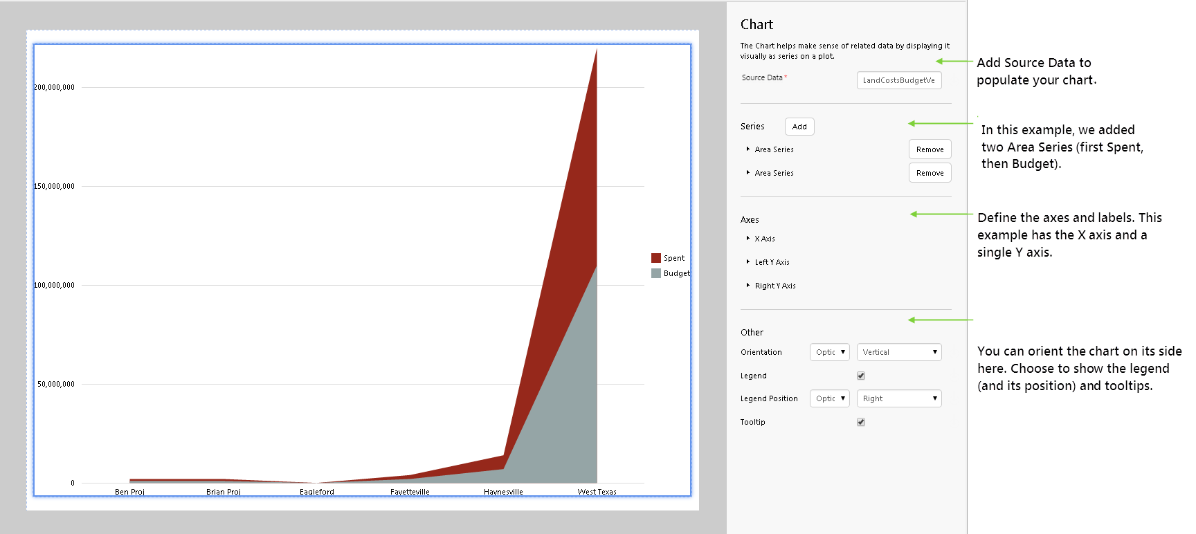 The area chart has a lot in common with the bar chart. The following diagram shows an area chart in design mode: