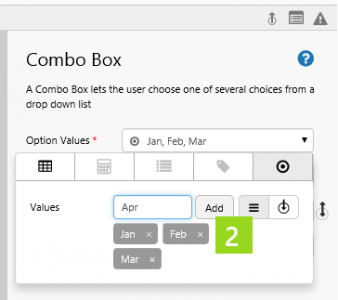 1. Drag and drop a Combo Box onto a grid cell. 2. Add a list of Values to the Combo Box's Option Values: Jan, Feb, Mar and Apr.
