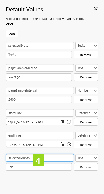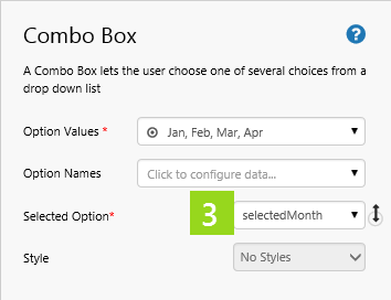 3. In the Selected Option drop-down list, type selectedMonth. 4. Add a default value: selectedMonth and give it a value: Jan.