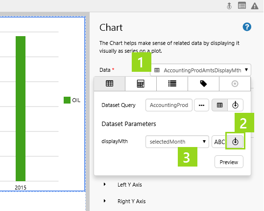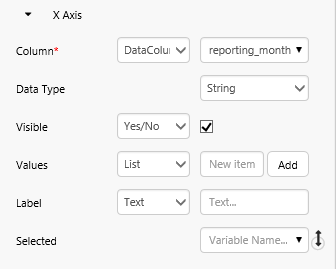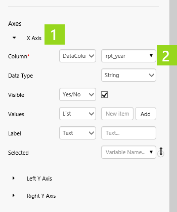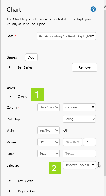 In this step, we'll update the chart's Selected X Axis to set the variable parameter: selectedRptYear.