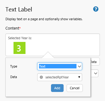 3. Configure the Text Label's Content: Type "Selected Year is:" then add the variable selectedRptYear.