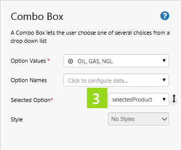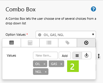 1. Drag and drop a Combo Box onto a grid cell. 2. Add a list of Values to the Combo Box's Option Values: OIl, GAS, NGL.