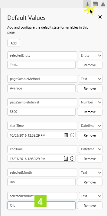 3. In the Selected Option drop-down list, type selectedProduct. 4. Add a default value: selectedProduct and give it a value: OIL.