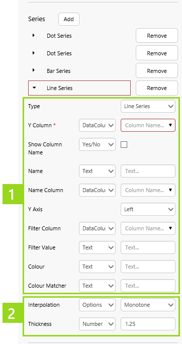 The different series types have specific properties listed after the general properties, as shown in section 2 of the screenshot above.