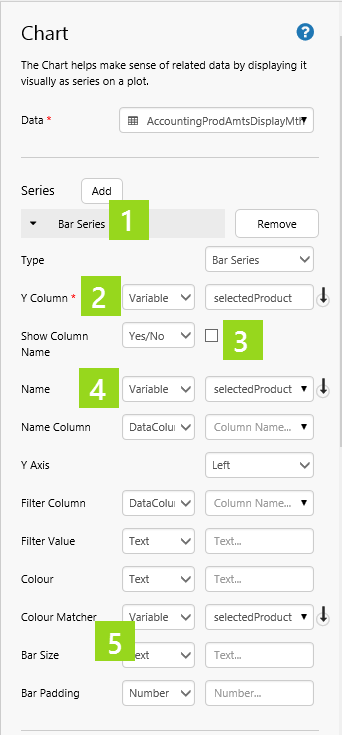 In this step, we'll update the chart's bar series to use a variable parameter for Y Column and Name: the Combo Box's selectedOption, selectedProduct.