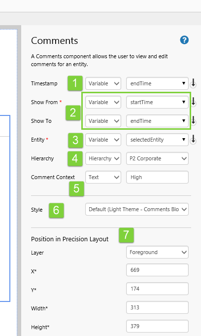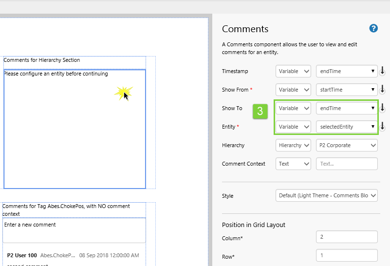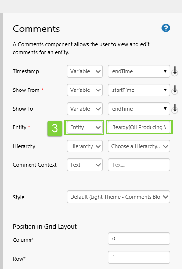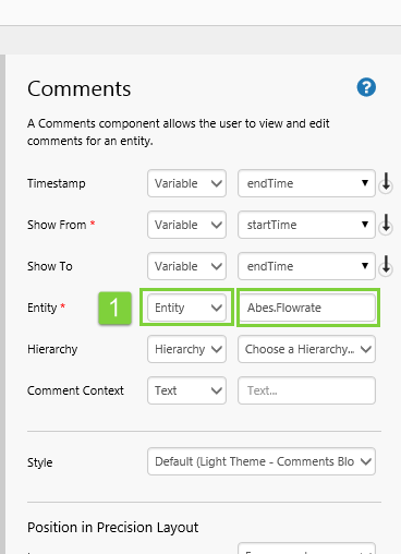 If you choose to use a hierarchy (choose Variable from the drop-down list to use a variable for this property, otherwise Hierarchy), then comments for the component's specified entity, as well as all of its descendent entities in the specified hierarchy, are shown in the comments list. This should only be used if the Entity property is an entity (not a tag or an attribute).