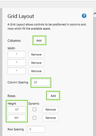 1. Drag and drop a Text Label into the top 2nd and 3rd cells of the first Grid Layout. Configure the two Text Labels as follows: