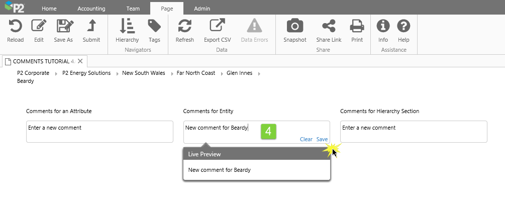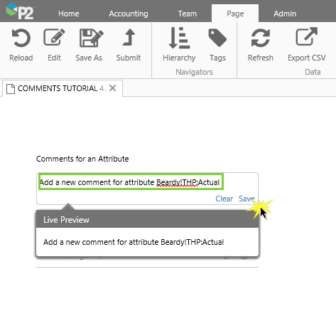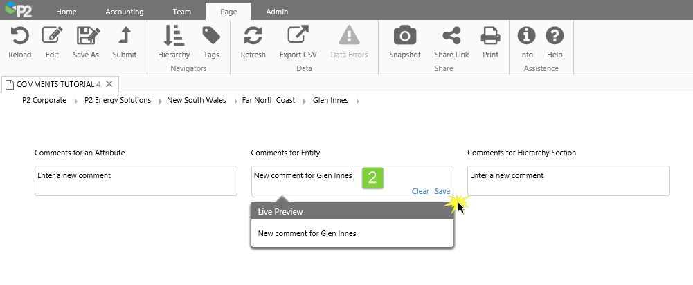 2. Type a comment in the edit box for the Comments component under the label Comments for Entity, then click Save or press Enter.
