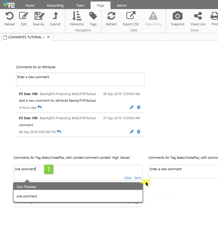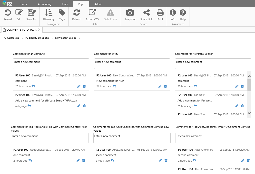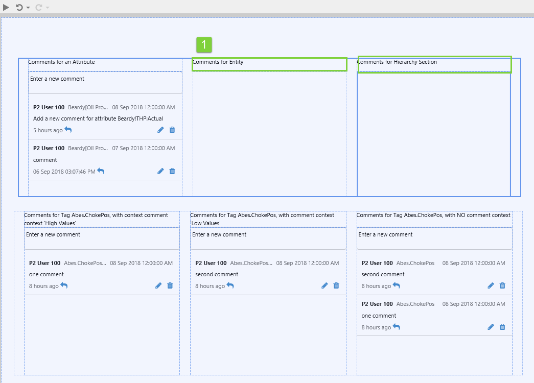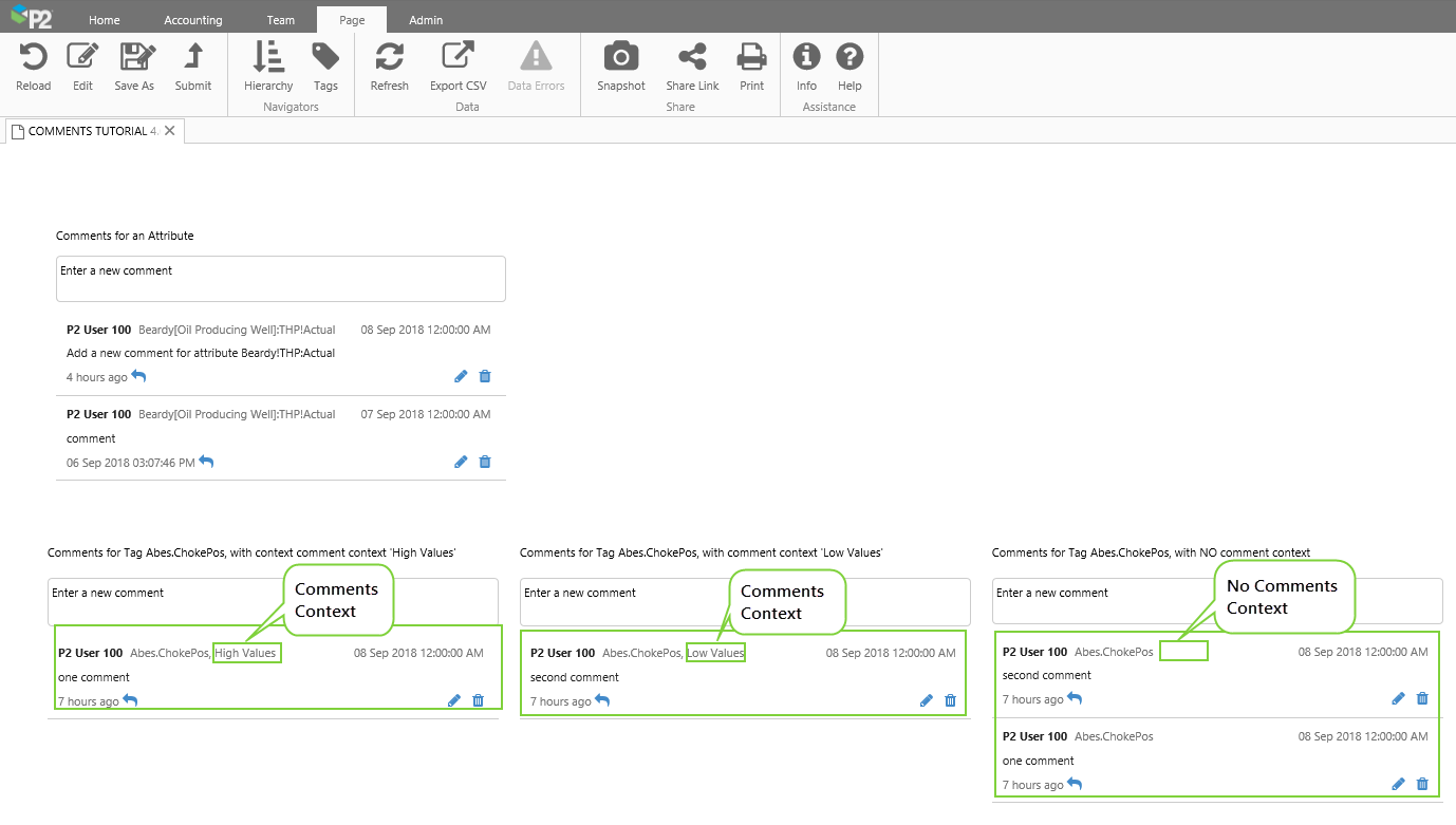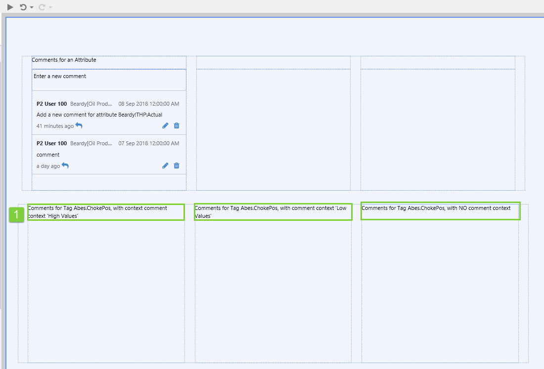 Users can add comments for data and comment context, for a timestamp specified by the page designer (defaulted to the page variable endTime) and can search for comments within the configured time range.