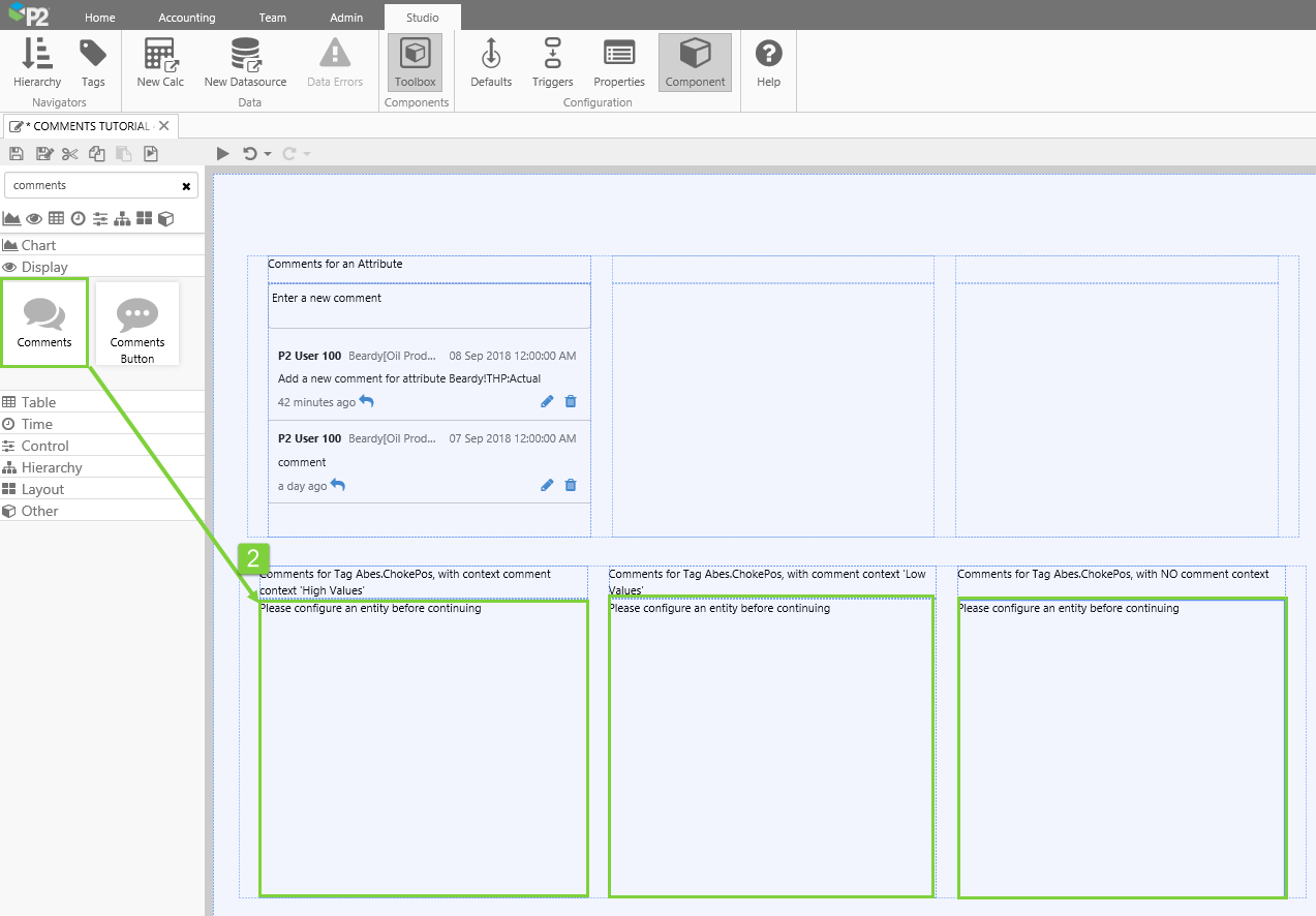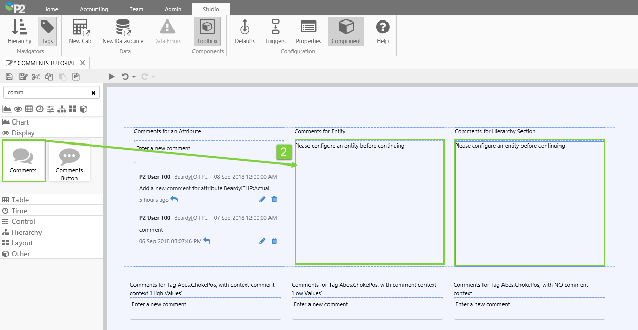 3. Configure the two Comments components as follows (keeping the default values for the remaining properties):