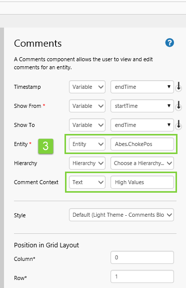 The most basic configuration for a Comments component is when only the Entity property is specified. This is the time series data that the comment is about, and can be a Tag, an Attribute, or an Entity.